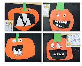 I chose to go through each step with the kids (as much as you can with 10 kindergartens.) So, for example, I started out by saying, "Cut a large oval or circle from your orange paper for the pumpkin." I also gave them the option to draw the shape on their paper before cutting it out. Some followed my directions (and example) and other chose to do their own thing for parts.